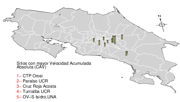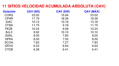 La velocidad acumulada absoluta (CAV por sus siglas en inglés) es otro parámetro que se usa para caracterizar el movimiento fuerte del suelo. Los datos están dados en cm/s para las componentes norte-sur (NS) y este-oeste (EW). El máximo de ambas se da en la tercera columna.