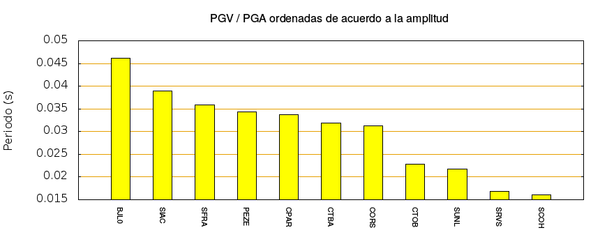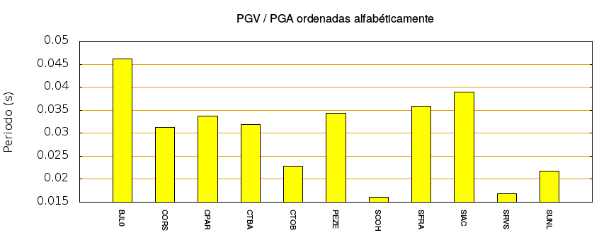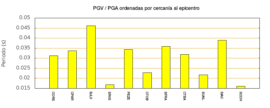 El cociente de la velocidad máxima (PGV) entre la aceleración máxima (PGA) brinda información de los periodos más significativos del movimiento del suelo. En el gráfico siguiente se muestran las estaciones ordenadas por su cercanía al epicentro. La más cercana está a la izquierda y la más lejana a la derecha. También se muestran los mismos datos en orden alfabético y ordenados de mayor a menor amplitud.