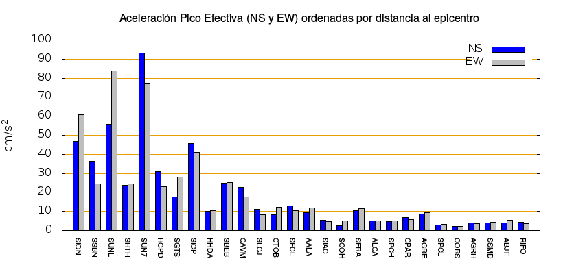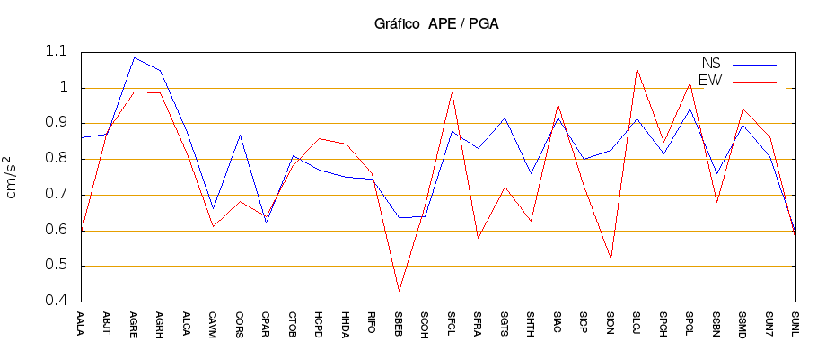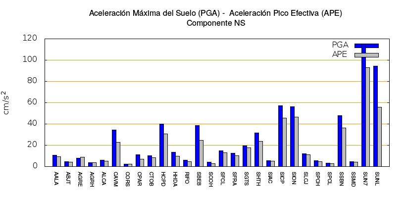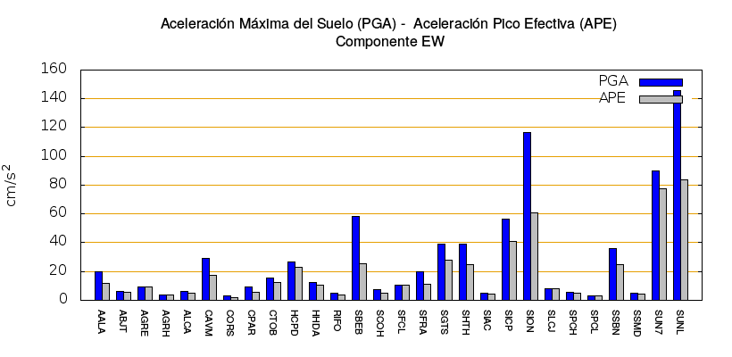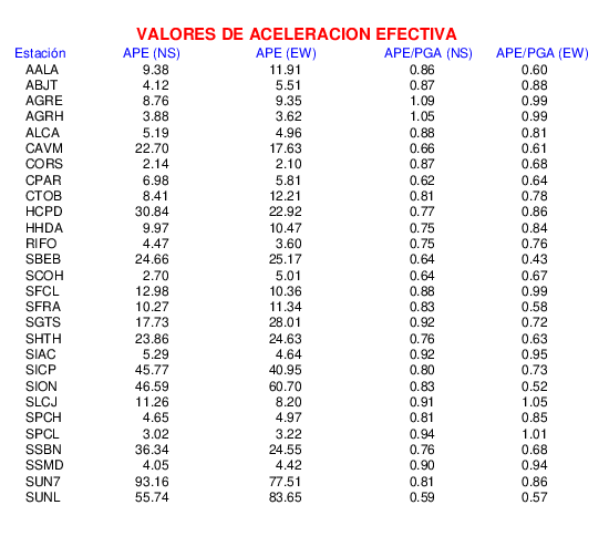 La siguiente tabla muestra los valores de aceleración efectiva para las componentes norte-sur (NS) y este-oeste (EW). También se muestra el valor del cociente entre la aceleración efectiva y la aceleración máxima (APE/PGA).