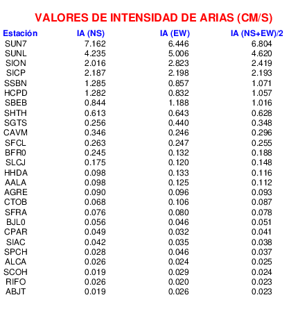 En esta sección se muestra el cáculo de la IA para la componente norte-sur (NS) y este-oeste (EW) de los registros de aceleración que tuvieron valores superiores a los 5 cm/s2, así como el valor total de esta que corresponde al promedio de ambas componentes horizontales.