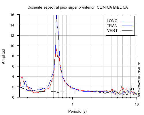 También se muestra el cociente espectral (en el rango de 0.1 a 10 s) entre el nivel superior (sea el último piso o la azotea) e inferior (sea el primero piso o el sótano) para cada una de las componentes LONG=longitudinal, TRAN=transversal y VERT=vertical. En los casos en que el nivel superior o inferior no estén disponibles al momento del sismo, se muestra una imagen con la leyenda "No se pudo calcular".
