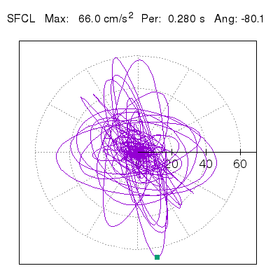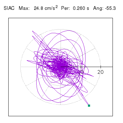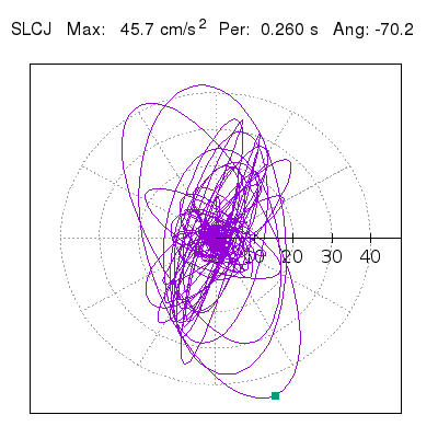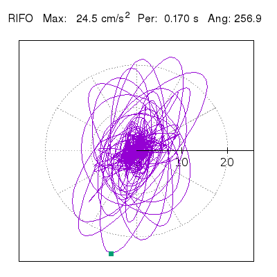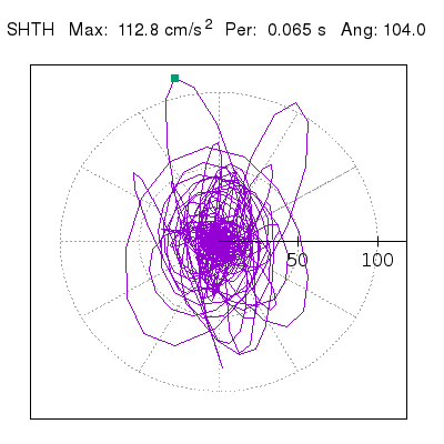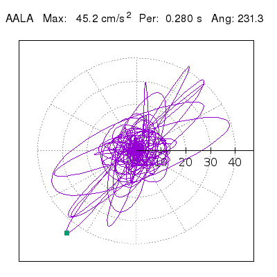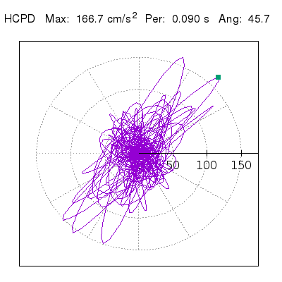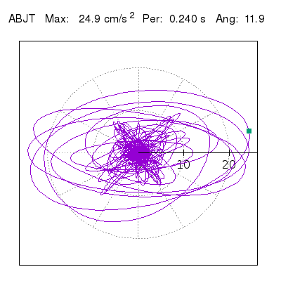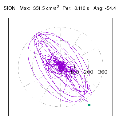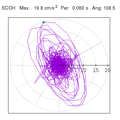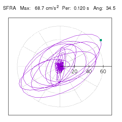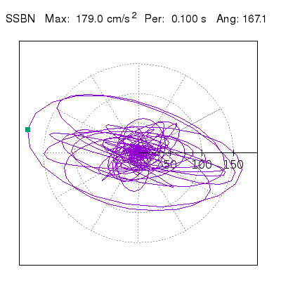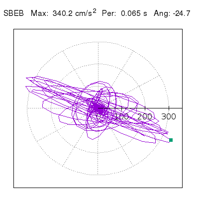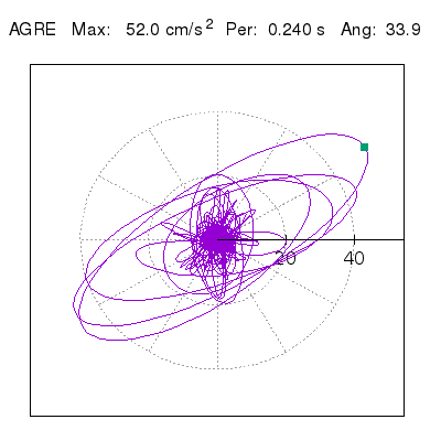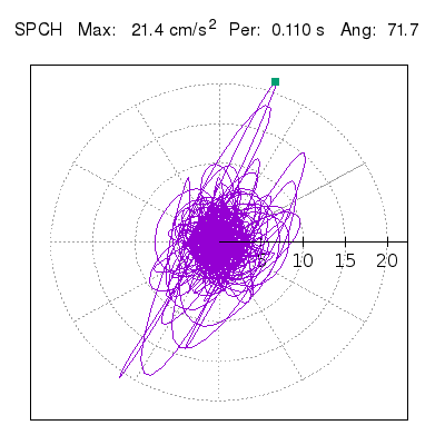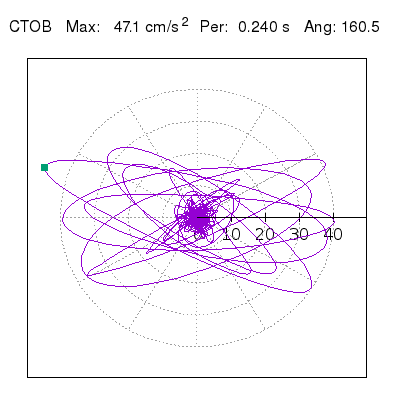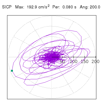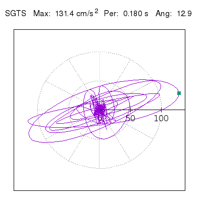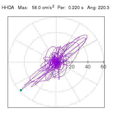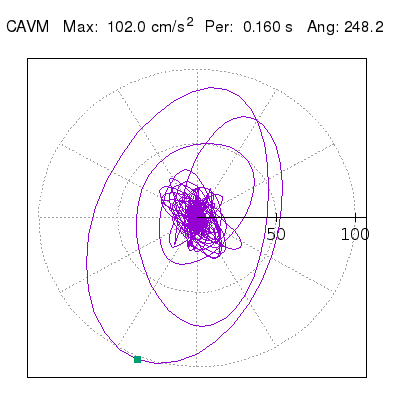 Tomando el periodo en el cual se presenta la amplitud máxima del espectro de respuesta máxima para cada estación, se representa la respuesta bidireccional en función del tiempo sobre el plano horizontal. Se identifica el punto (color verde en cada figura) del cual se desprende la orientación mostrada en el mapa de la sección superior. El valor de la acelereración máxima corresponde al punto del espectro de respuesta para el periodo indicado.