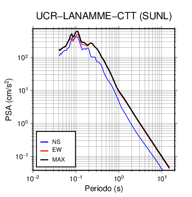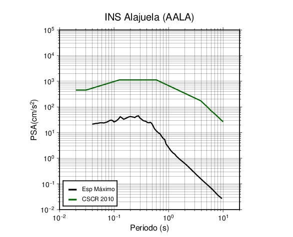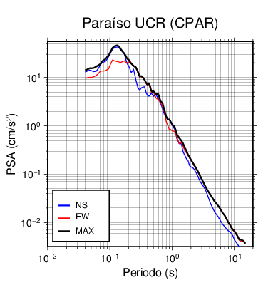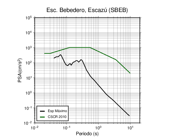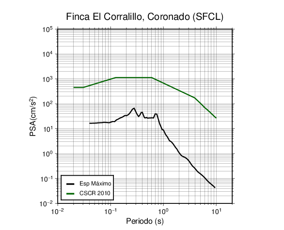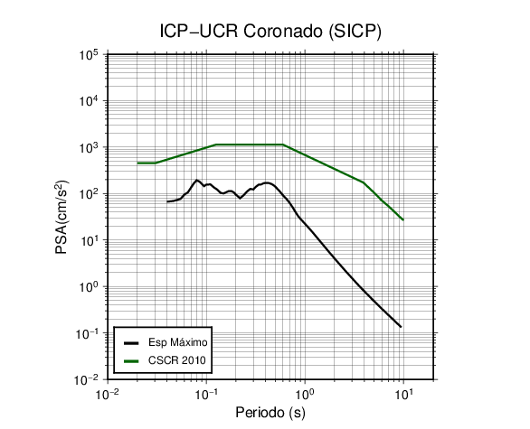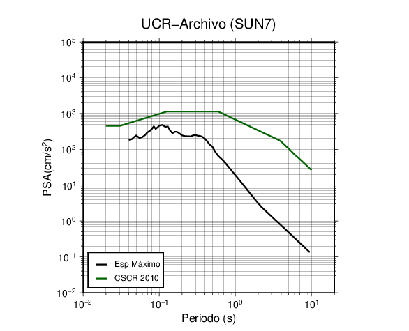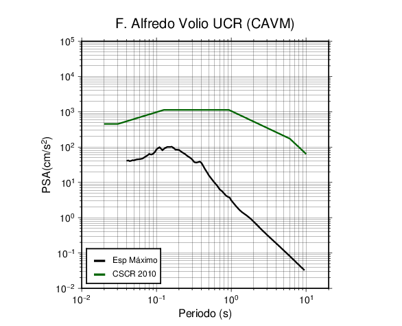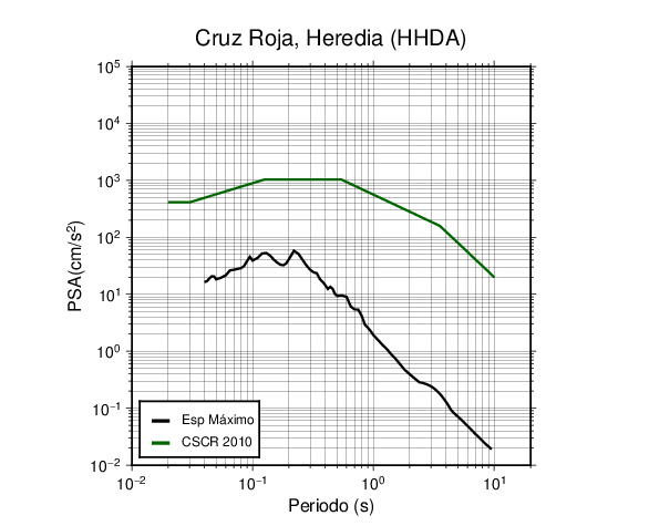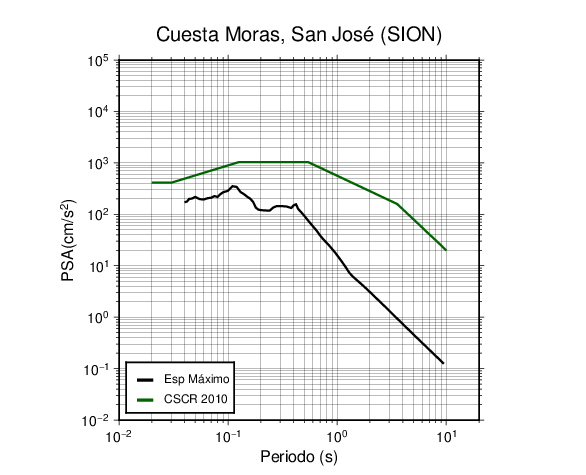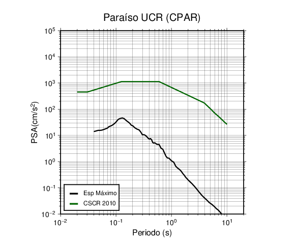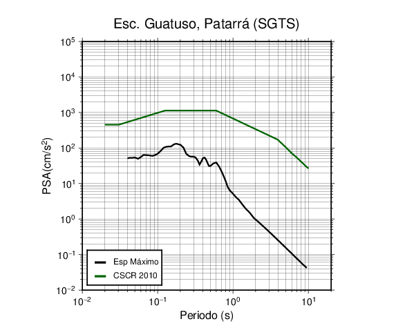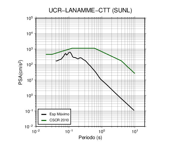 En los siguientes gráficos, la traza verde es el espectro propuesto por el CSCR-2010, la traza negra es el espectro máximo de este sismo. El valor de la amplitud está dado en pseudoaceleración en cm/s2.