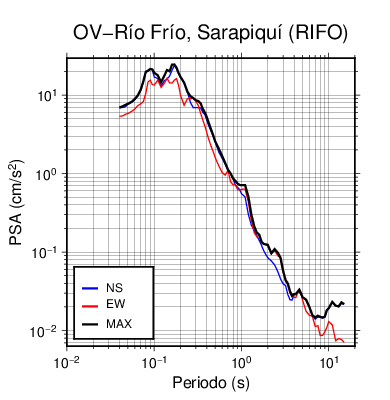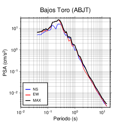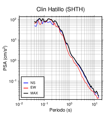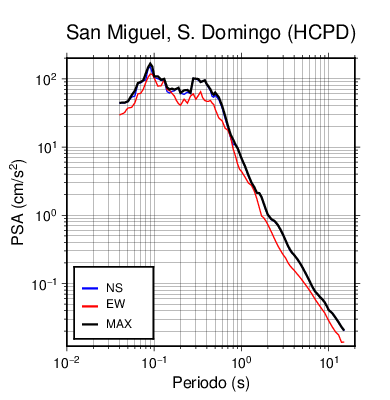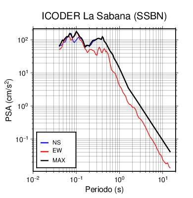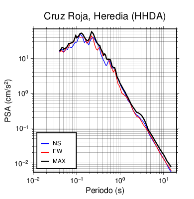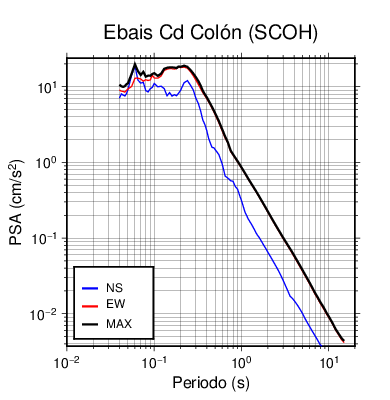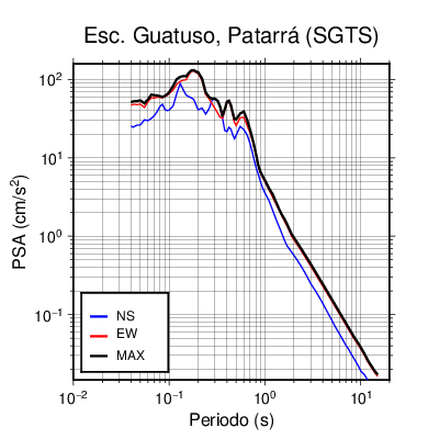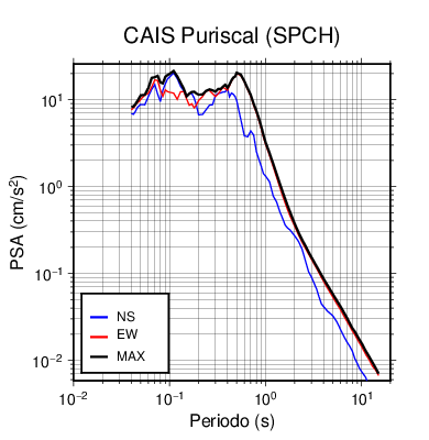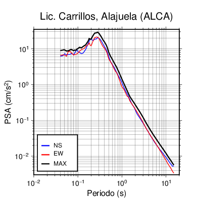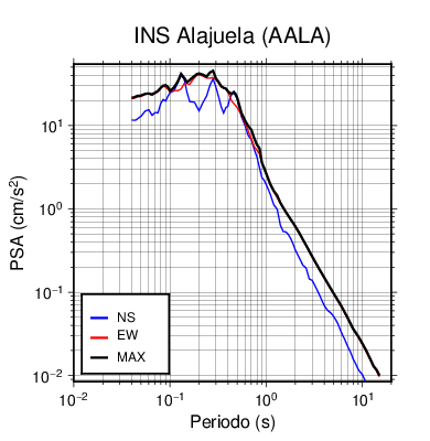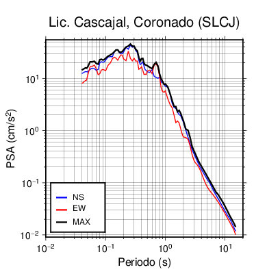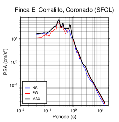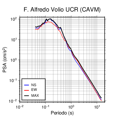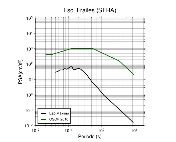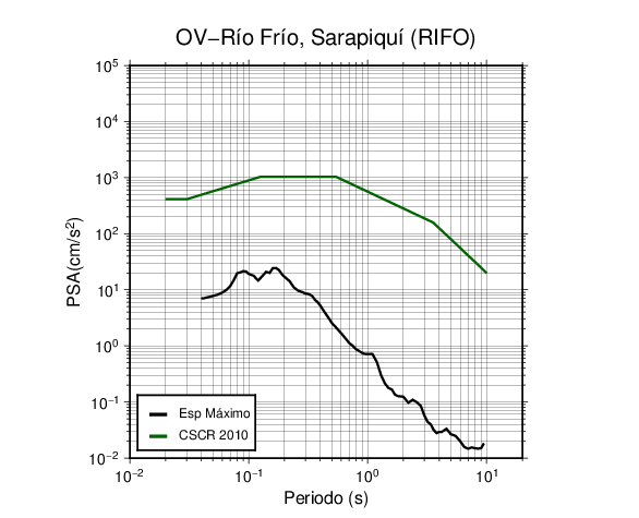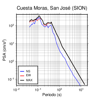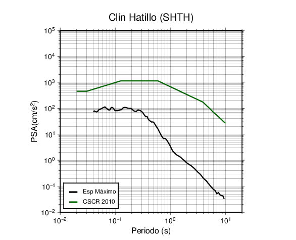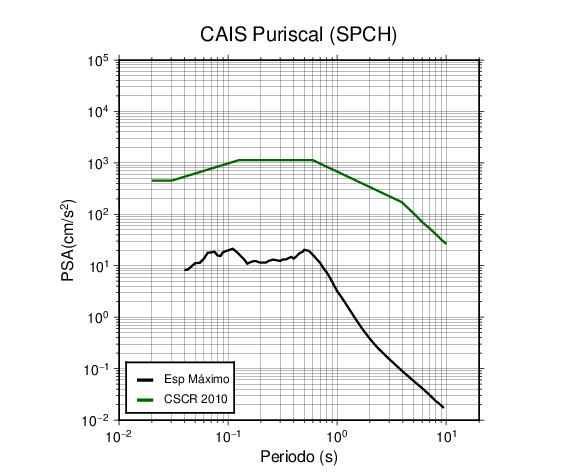 En los siguientes gráficos, la traza verde es el espectro propuesto por el CSCR-2010, la traza negra es el espectro máximo de este sismo. El valor de la amplitud está dado en pseudoaceleración en cm/s2.