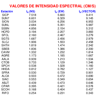 En esta sección se muestra el cáculo de la intensidad de Housner, IH para la componente norte-sur (NS) y este-oeste (EW) y la suma vectorial de los registros de aceleración que tuvieron valores superiores a los 5 cm/s2.