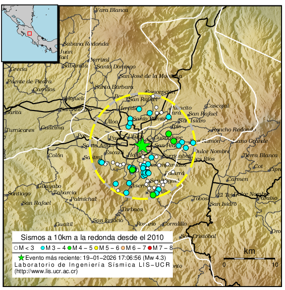 A 10km a la redonda del epicentro, el LISUCR ha localizado también los siguientes 93 sismos ocurridos desde el 2010. Todos ellos con profundidades inferiores a los 40km.