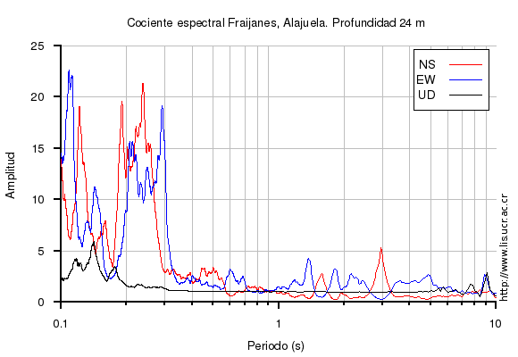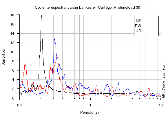 El cociente espectral se obtuvo dividiendo el espectro de amplitud de la componente en superficie con respecto a la componente en profundidad (NS=norte-sur, EW=este-oeste, UD=vertical)