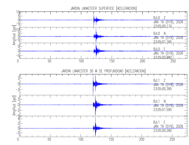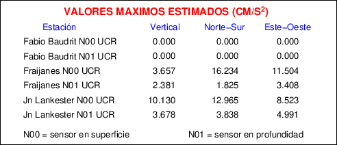 Aquí se muestran las formas de onda y cocientes espectrales de los sensores colocados en pozo . Uno se ubica en el Jardín Lankester en Paraíso de Cartago con 30 m de profundidad y el otro en la Estación Experimental Fabio Baudrit en Alajuela con 40 m de profundidad. La tabla muestra los valores de aceleración máxima (PGA) leídos de las tres componentes en superficie (N00) y en profundidad (N01)