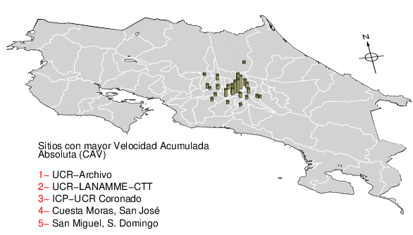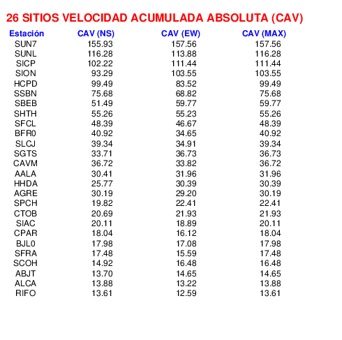 La velocidad acumulada absoluta (CAV por sus siglas en inglés) es otro parámetro que se usa para caracterizar el movimiento fuerte del suelo. Los datos están dados en cm/s para las componentes norte-sur (NS) y este-oeste (EW). El máximo de ambas se da en la tercera columna.