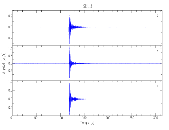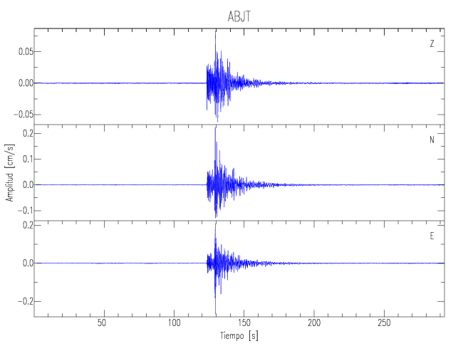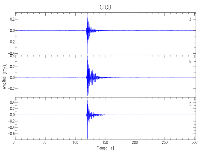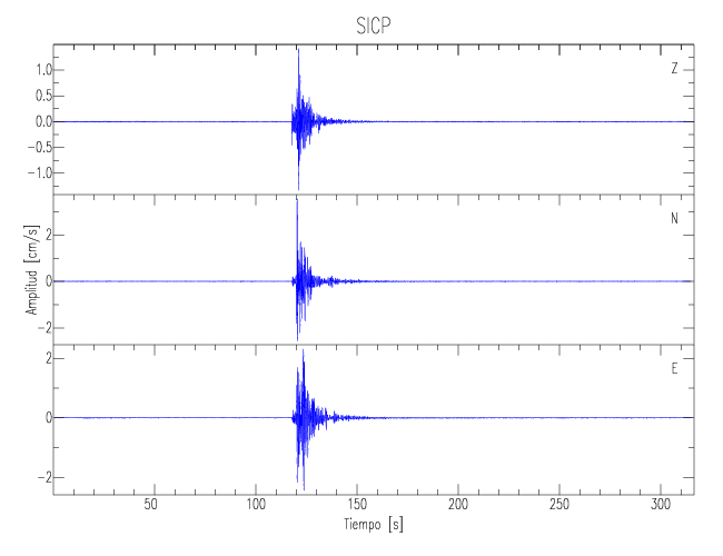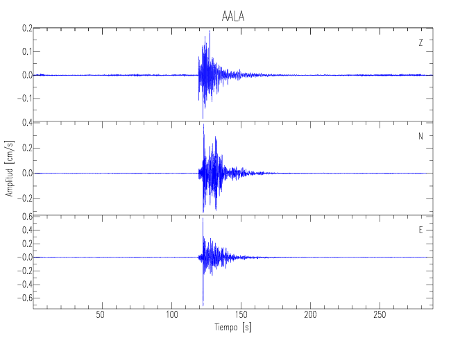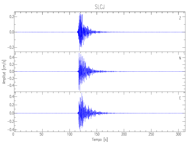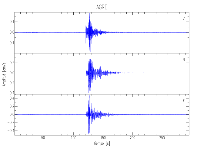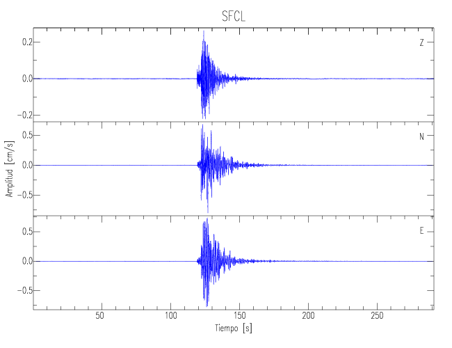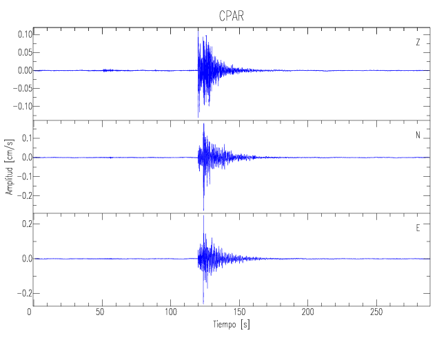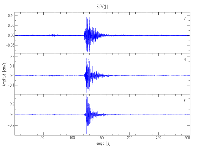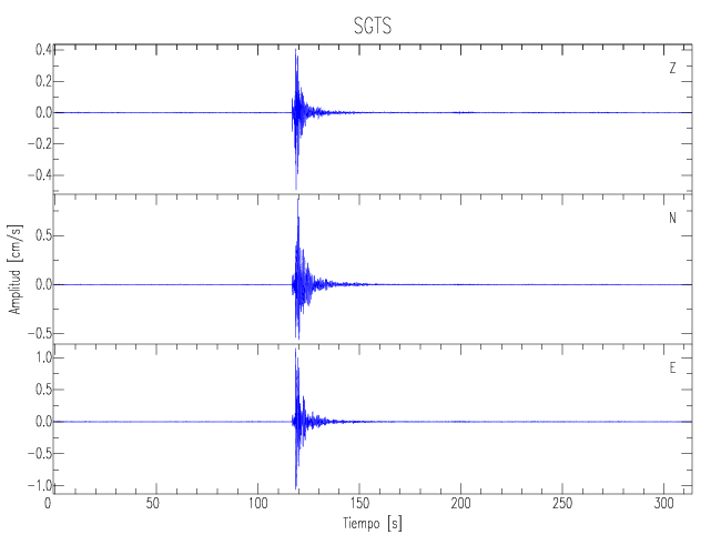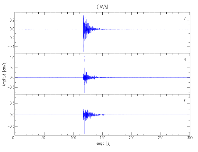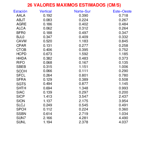 Los registros de velocidad se obtienen de la integración de los datos de aceleración. Esta tabla contiene los valores de velocidad máxima (PGV por sus siglas en inglés) para cada componente en cm/s. Las estaciones se listan en orden alfabético y corresponden a los sitios en que el nivel de aceleración fue superior a los 5 cm/s2.
