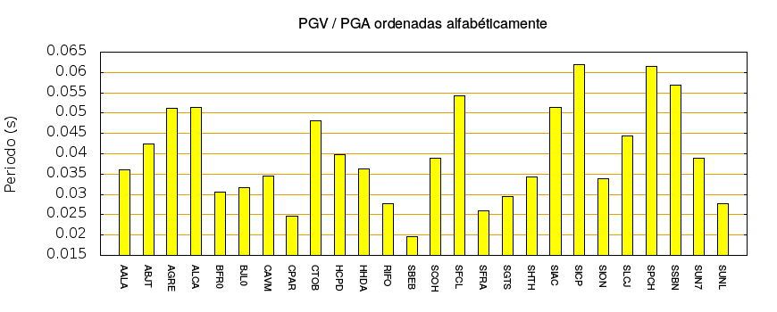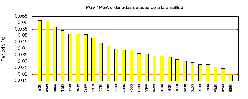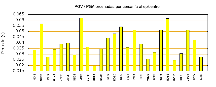 El cociente de la velocidad máxima (PGV) entre la aceleración máxima (PGA) brinda información de los periodos más significativos del movimiento del suelo. En el gráfico siguiente se muestran las estaciones ordenadas por su cercanía al epicentro. La más cercana está a la izquierda y la más lejana a la derecha. También se muestran los mismos datos en orden alfabético y ordenados de mayor a menor amplitud.